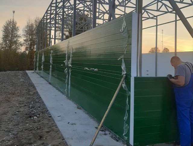 Одно из больших зданий для мойки и ремонта грузовых машин и спецтехники общей площадью более 200 м2. На этом объекте изначально был смонтирован металлокаркас и все подготовлено для монтажа стеновых и кровельных сэндвич-панелей.